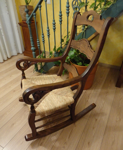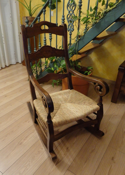 Tiene dos opciones como sillon igual que en las fotos o tambien como mecedora ,con un toque de envejecido y en acabados nogal como en las fotos o resto del muestrario.